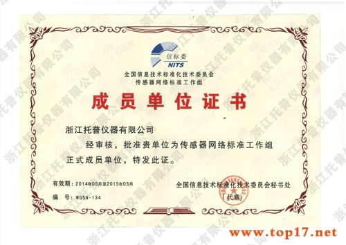圖為:國家傳感器網(wǎng)絡(luò)標(biāo)準(zhǔn)工作組成員單位證書