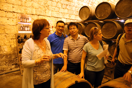 圖為:托普儀器陳渝陽總經(jīng)理(左二)隨考察團(tuán)參觀葡萄酒廠