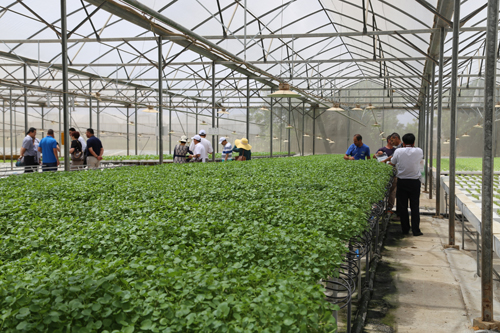 圖為:考察團(tuán)考察無土栽培種植技術(shù)