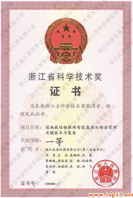 為了鼓勵科學技術創新,促進科學技術進步和社會經濟發展,根據《浙江省科學技術獎勵辦法》,托普儀器的科研項目——《設施栽培物聯網智能監控與精準管理關鍵技術與裝備》,經過省科學技術評審委員會審定,被評為2012年度浙江省科學技術獎一等獎。