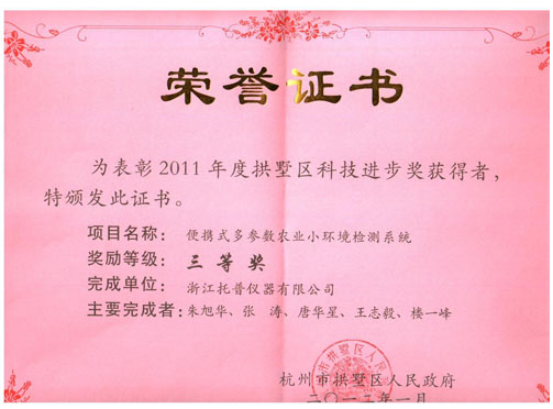 托普儀器研發(fā)的便攜式多參數(shù)農(nóng)業(yè)小環(huán)境監(jiān)測(cè)系統(tǒng)獲得全面成功,同時(shí)該項(xiàng)目也喜獲2011年度浙江省杭州市拱墅區(qū)科技進(jìn)步三等獎(jiǎng)。