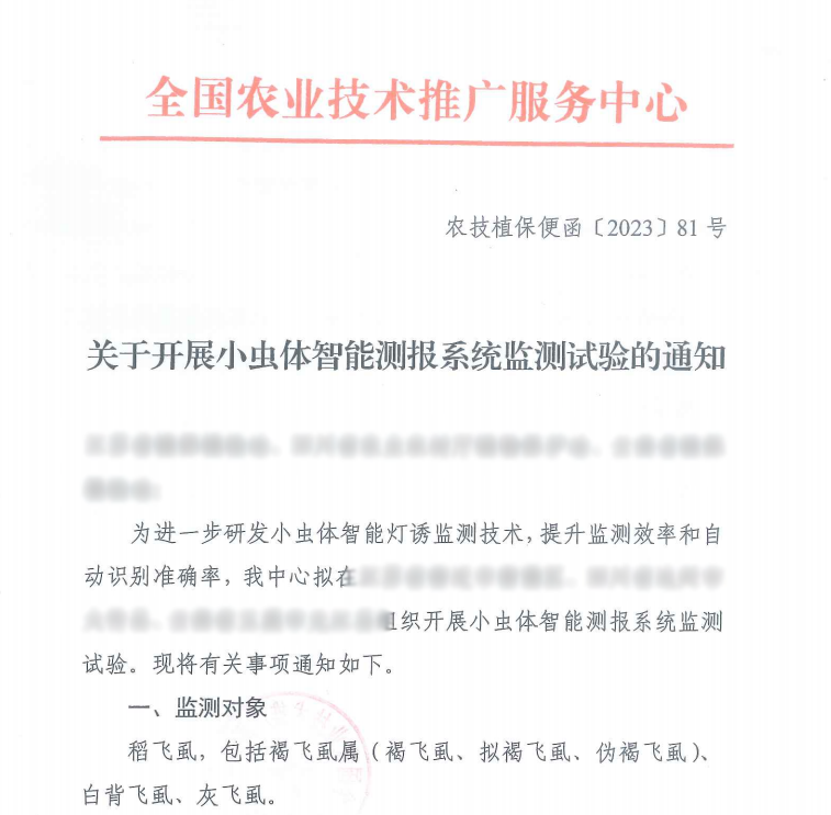 2023年5月11日,全國農(nóng)業(yè)技術(shù)推廣服務(wù)中心印發(fā)了試驗(yàn)方案《關(guān)于開展小蟲體智能測報(bào)系統(tǒng)監(jiān)測試驗(yàn)的通知》(農(nóng)技植保便函[2023]81號(hào)),委托江蘇、四川、云南等相關(guān)單位開展燈具誘集效果和識(shí)別準(zhǔn)確率驗(yàn)證。