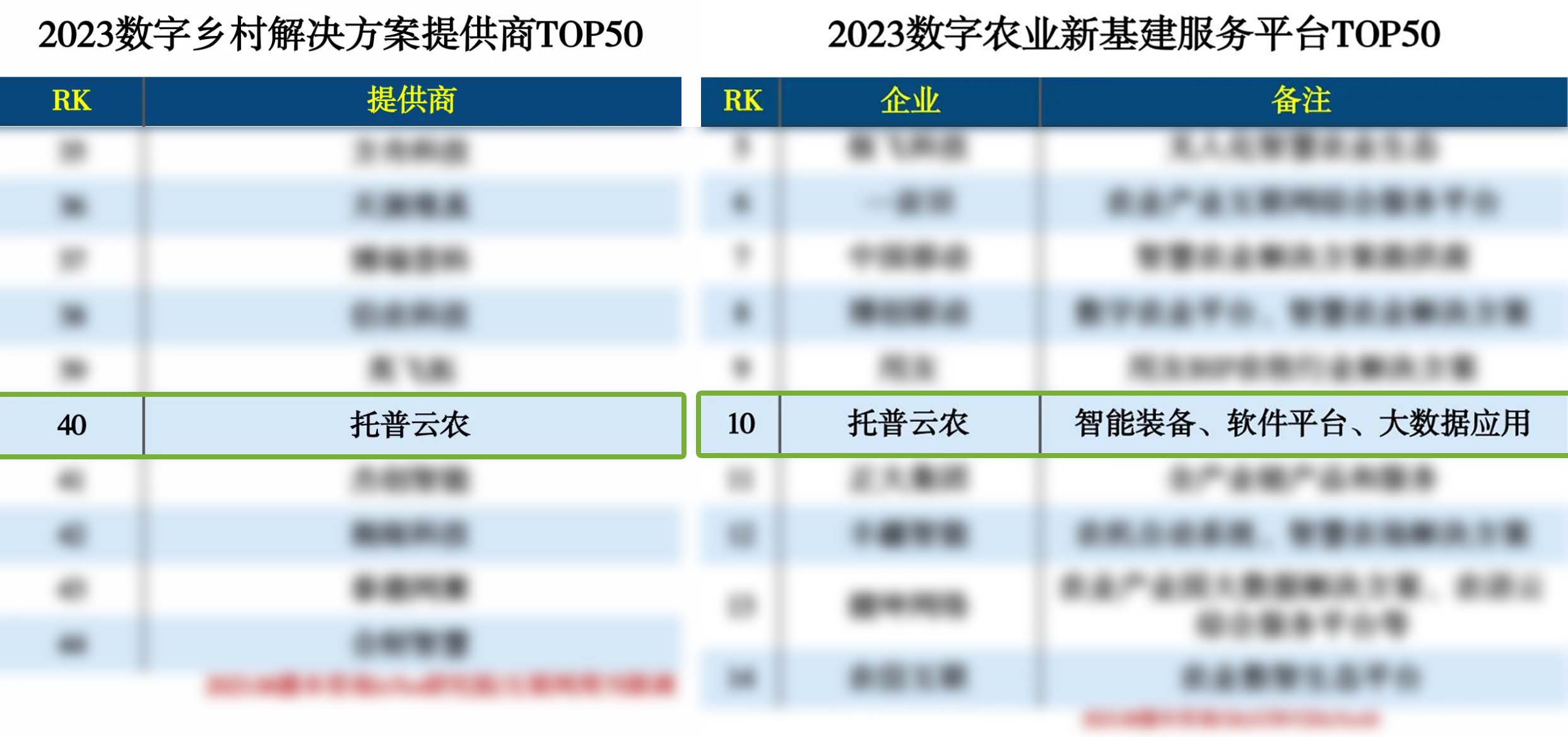 此前,托普云農還曾榮登“2023數字鄉村解決方案提供商TOP50”榜單和“2023數字農業新基建服務平臺TOP50”榜單。