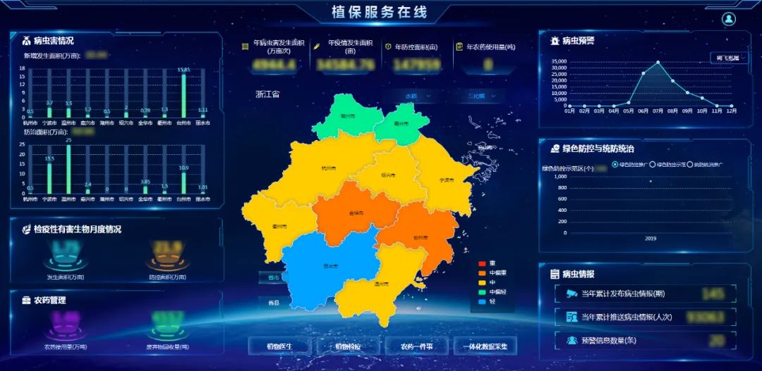 為提高病蟲害監測預警水平,完善病蟲害測報體系,托普云農聯合浙江省植保檢疫與農藥管理總站打造了集監測預警、分析研判到統防統治、服務反饋為一體的浙江植保服務在線平臺,科技賦能,讓蟲情測報更加智能,蟲害防控更加精準。該平臺匯集了智能裝備自動采集數據與人工調查數據,涵蓋農田地塊面積、地塊種植作物、常見病蟲害等數據信息,對害蟲信息進行動態展示和對比分析,并聯動水文、氣象等要素進行綜合研判,多種形式呈現各地區的病蟲害的發生發展動態,實現智能自動預警和病蟲情報精準推送服務,成功打造“智能監測→模型預警研判→決策服務”的數字化聯動響應模式和數據應用閉環,確保應防盡防、應治盡治,實現植保工作的閉環管理。