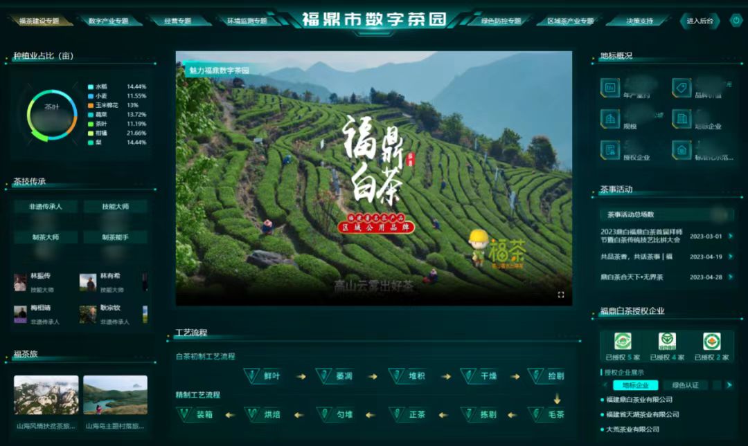 在福鼎,托普云農(nóng)打造的數(shù)字茶園,基于福鼎茶葉全產(chǎn)業(yè)及企業(yè)生產(chǎn)、加工、銷售等環(huán)節(jié)的大數(shù)據(jù)平臺,實現(xiàn)人、地、物精細化管理,提供了茶葉生產(chǎn)預警、產(chǎn)銷分析、產(chǎn)量分析、品質(zhì)分析、產(chǎn)業(yè)發(fā)展等服務,為福鼎茶葉生產(chǎn)經(jīng)營管理提供科學的輔助決策。