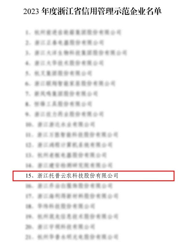 近日,浙江省市場監督管理局公布《2023年度浙江省信用管理示范企業名單》,浙江托普云農科技股份有限公司(以下簡稱“托普云農”)榮譽入選。