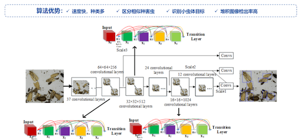 目前,托普云農采用卷積神經網絡深度學習的方法建立識別模型,已實現2063種農業害蟲的智能識別。其中,二化螟、稻縱卷葉螟、玉米螟、棉鈴蟲、小菜蛾等國家一二類趨光性及主要農林害蟲的識別準確率達到97.5%;稻飛虱、葉蟬、綠盲蝽等毫米級小蟲體識別準確率達90%以上。